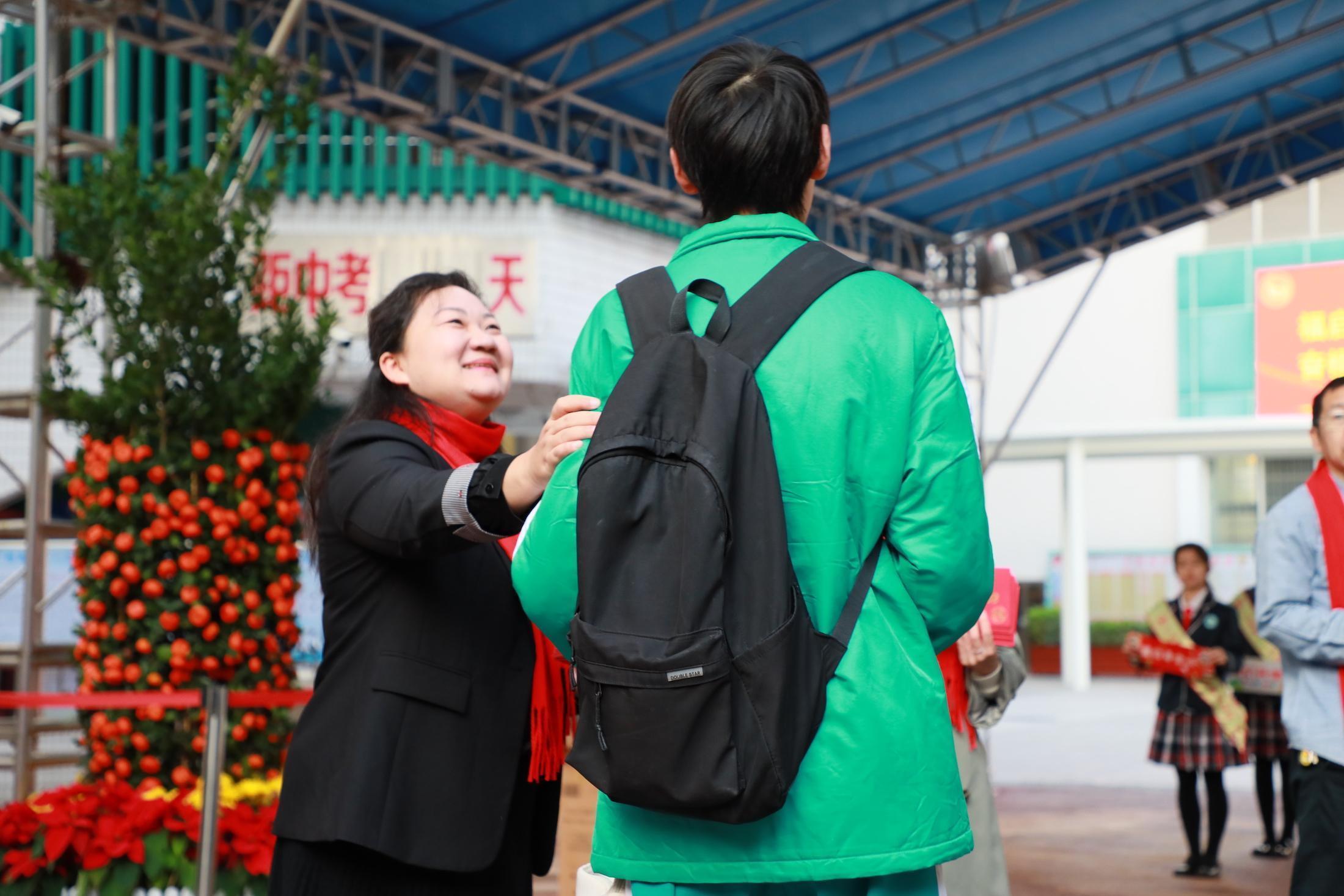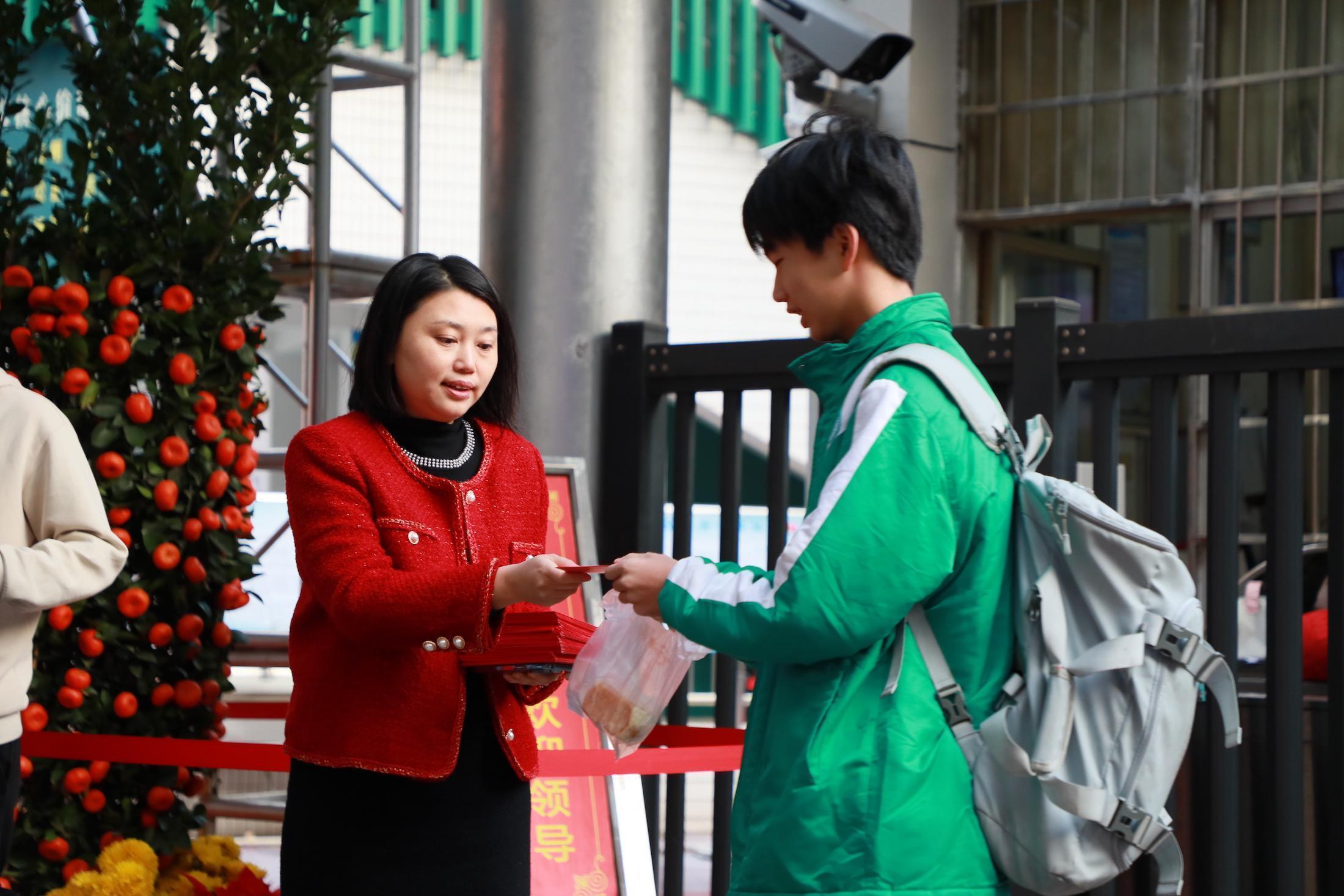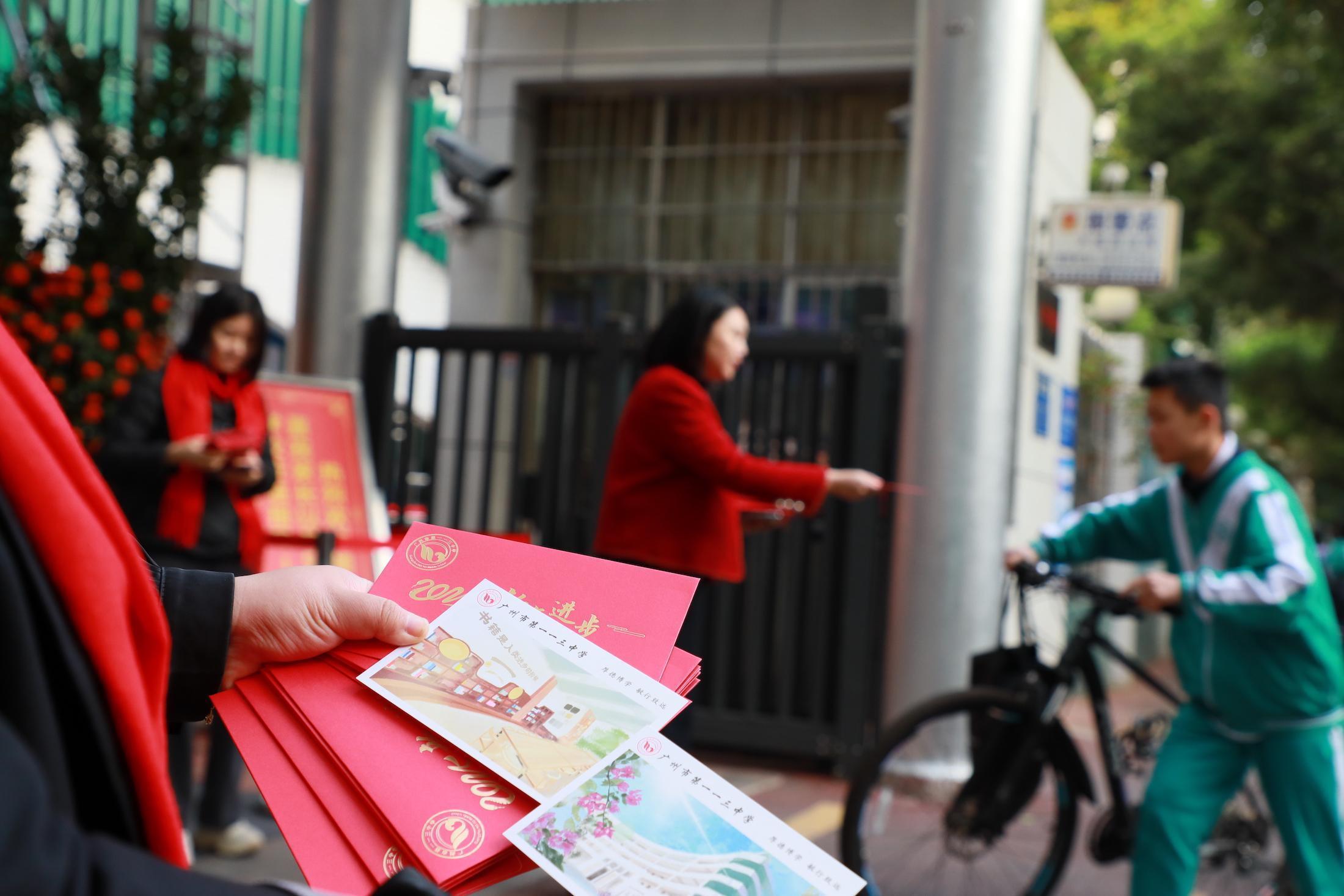 广州市第一一三中学的老师给学生派发装着手绘明信片的“红包”。人民网 宁玉瑛摄