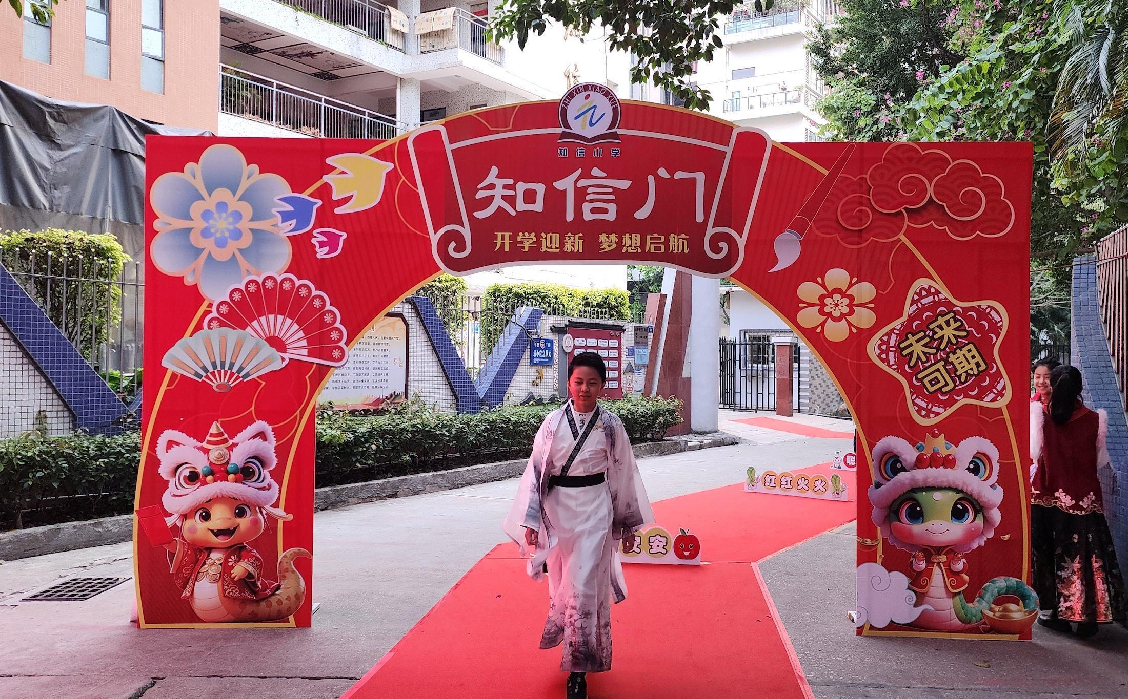 广州市海珠区知信小学的学生跨过“知信门”,迎接新的挑战,实现新的成长。广州市海珠区知信小学供图