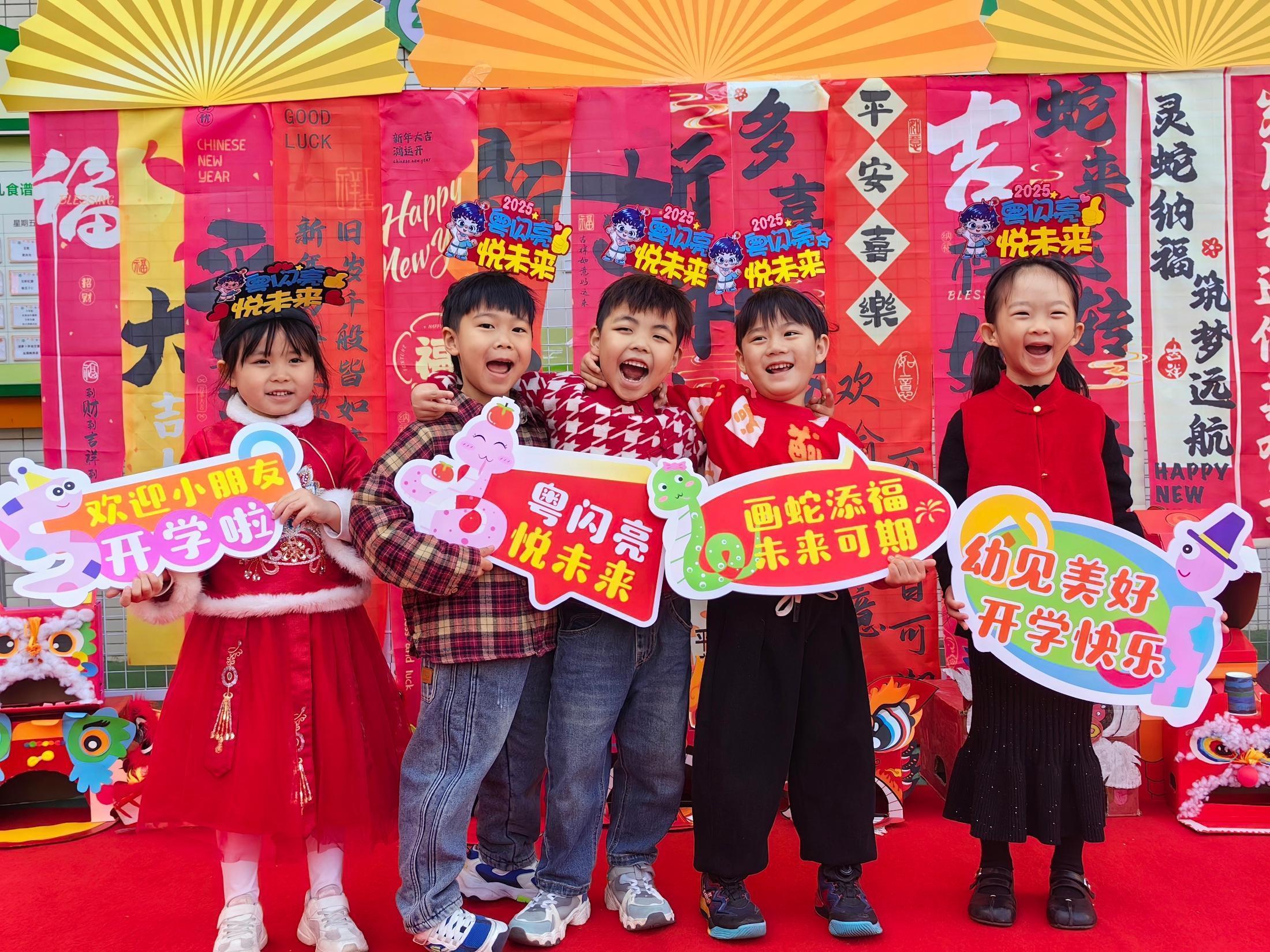 东莞市长安镇乌沙幼儿园,学生们在欢乐氛围中迎接新学期。东莞市长安镇乌沙幼儿园供图“现在我已经收集到五个‘太阳娃’了,明年我就毕业了。”广州市天河区华阳小学的学生拿出自己已经收集的牛、虎、兔、龙“太阳娃”和今天新收到的蛇“太阳娃”新年吉祥物。